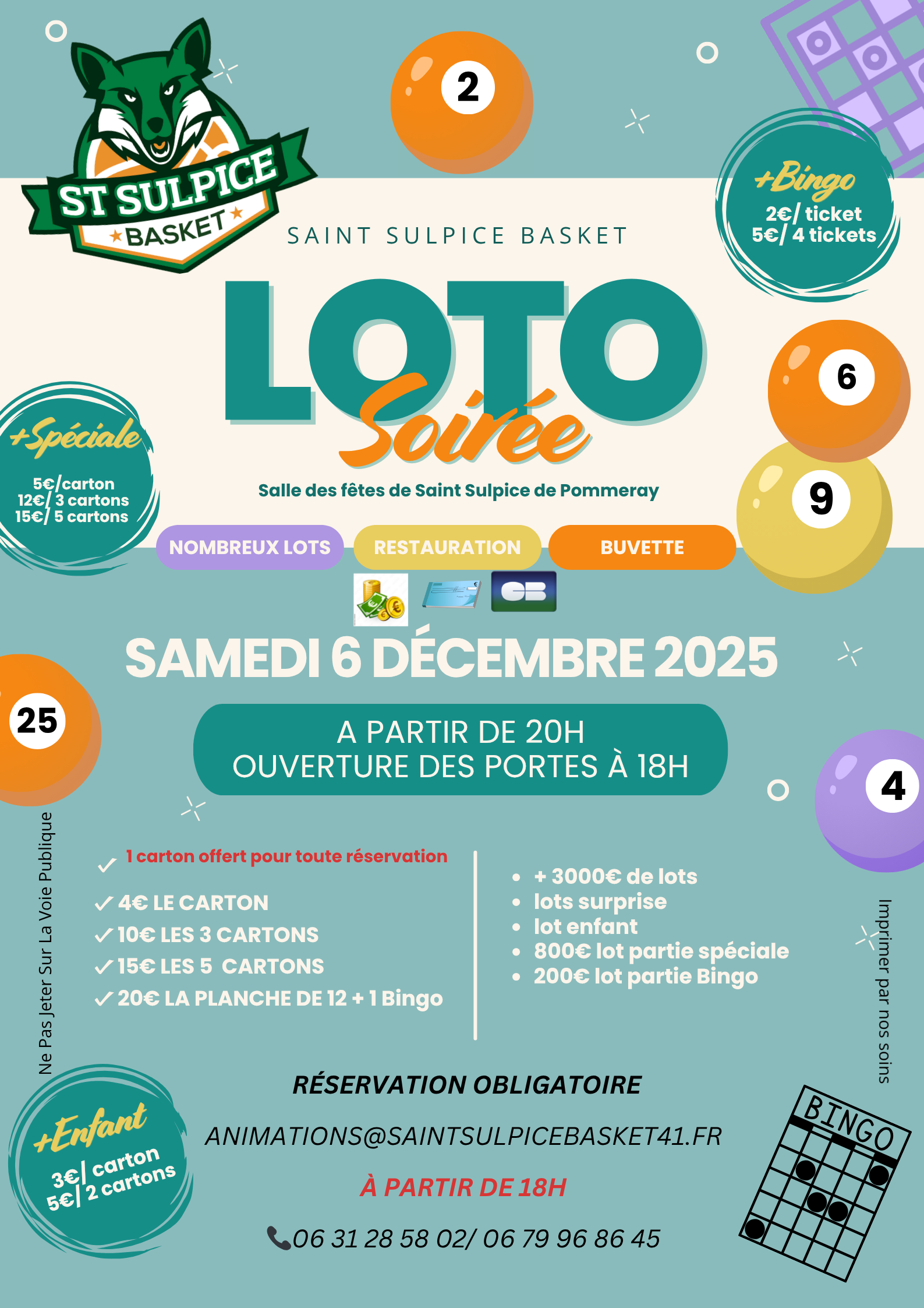 La réservation est obligatoire et se fait par mail à l’adresse : animations@saintsulpicebasket41.fr.